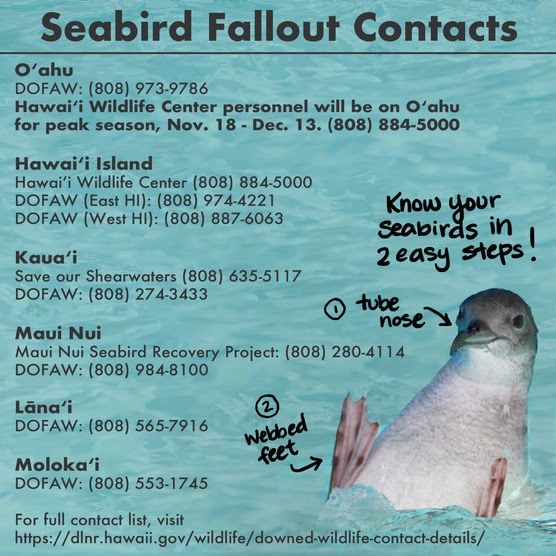 Birds can be dropped off 24/7 at Feather & Fur Animal Hospital, James Campbell National Wildlife Refuge, the Hawaiian Humane Society, and Hawai'i Wildlife Center.